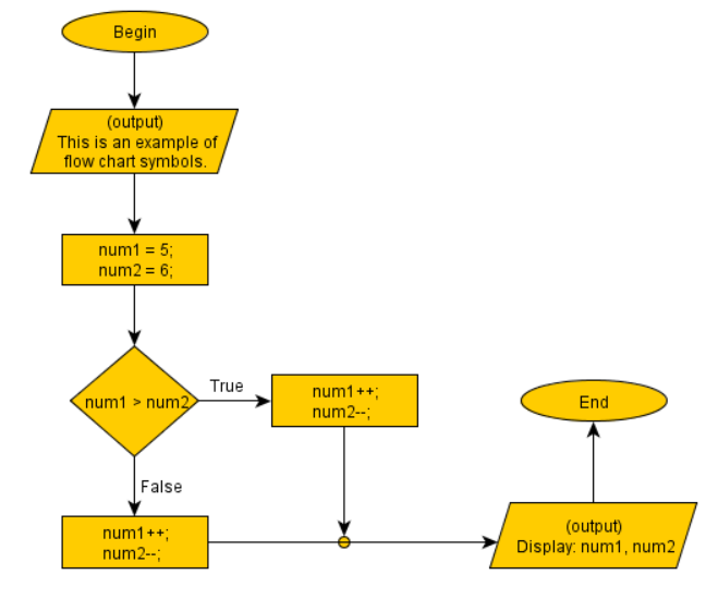 Flowcharts are written with program flow from the top of a page to the bottom. Each command is placed in a box of the appropriate shape, and arrows are used to direct program flow.