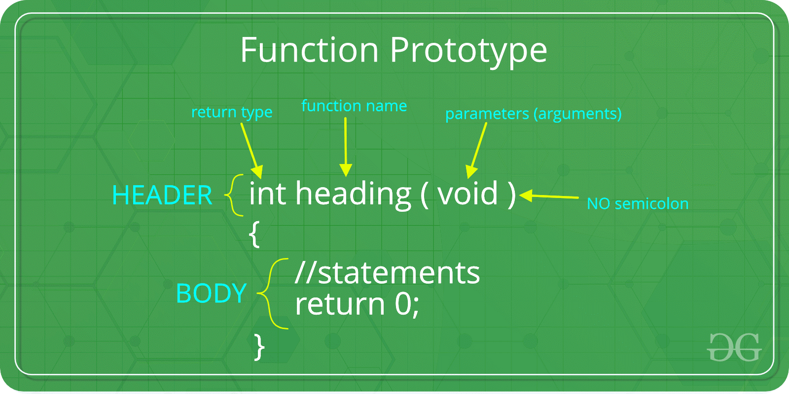 return signifies the end of a function. Here the function is main, so when we hit return 0, it exits the program. We are returning 0 because we mentioned the return type of main function as integer (int main). A zero indicates that everything went fine and a one indicates that something has gone wrong.